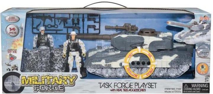 Zestaw wojskowy z dźwiękiem Czołg posiada 4 przyciski odpowiadające za różne dźwięki i frazy (w języku angielskim).