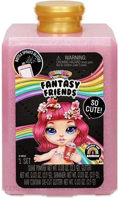 Fantastyczna nowość od MGA. Cudne mini laleczki do kolekcjonowania. Jest ich 16, zbierz je wszystkie!Rainbow Suprise Fantasy to nie tylko laleczki, to również super zabawa!Dzięki laleczce możesz stworzyć slima. Wystarczy że dasz jej pić (w zestawie napój), potrząśniesz nią, odczekasz kilka minut a potem naciśniesz na jej brzuszek aby wydobył się gotowy slime. Slime możesz ozdabiać dołączonymi do zestawu brokatami lub spryskać go glitterowymi perfumami. Zbierz różne kolory slime i zrób swoją własną tęczę!Ten zestaw, to niespodzianka! Nie wiemy co jest w środku, przekonasz się dopiero gdy otworzysz.W zestawie: laleczka ze slimem, perfum oraz akcesoria.