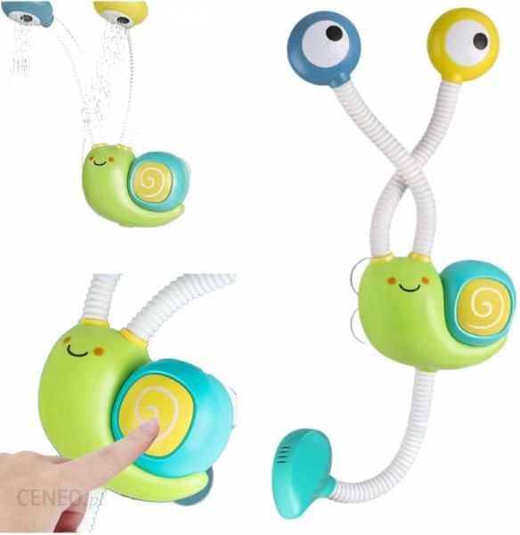 Zabawki zabawka do kąpieli na baterie płaczący ze śmiechu ślimak prysznic zielonyPrysznic ślimak to świetna zabawka do kąpieli dla dzieci :). Twoje dziecko niechętnie się kąpie lub boi się wody? Prysznic ślimak może Ci pomóc zachęcić dziecko do kąpieli :).Uatrakcyjnij kąpiel swojemu dziecku :).Wymiary ślimaka: 72 x 17 x 9 cmDługość pryszniców oczu z rurkami : 30 cmWiek: 18m+Zabawka posiada certyfikat CE, En71.Zabawka do kąpieli prysznic ślimak posiada włącznik ON/OFF umieszczony na domku ślimaka.Umieść listek znajdujący się na samym dole pod powierzchnią wody. Poprzez dziurki w liściu zabawka będzie pobierała wodę, która będzie wylatywała poprzez oczka ślimaka.Zabawka może pełnić funkcję prysznica, pod którym można kąpać i spłukiwać dziecko.Węże z oczkami ślimaka są giętkie i elastyczne. Można prysznic wziąć do rączki i manewrować słuchawką prysznicową w dowolną stronę.Zabawkę można przymocować do wanny, kabiny bądź zlewu na przyssawki, które znajdują się na tyle ślimaka.W zestawie znajduje się śrubokręt, aby sprawnie zamontować baterie.Zabawka rozwijazdolności logicznego myśleniawspomaga rozwój dziecka,pozwala poznawać kolory,rozwija koordynację wzrokowo-ruchową,pomaga identyfikować kształty.W skład zestawu wchodzikorpus ślimakadwa prysznice zakończone oczkamiśrubokrętkolorowe opakowanieWymiary opakowania: 24,5 x 20,5 x 11,5 cmWymiary ślimaka: 72x 10 cmx8cmDługość prysznica z rurką: 70 cmBaterie: 3 x AA (brak w zestawie)Wiek: 18m+Zabawka posiada certyfikat CE, En71.UWAGA! Poza listkiem zabawka nie jest wodoodporna, nie można jej zanurzać w wodzie.Zabawka zapakowana w ładne kolorowe pudełko.Idealnie nadaje się na prezent….